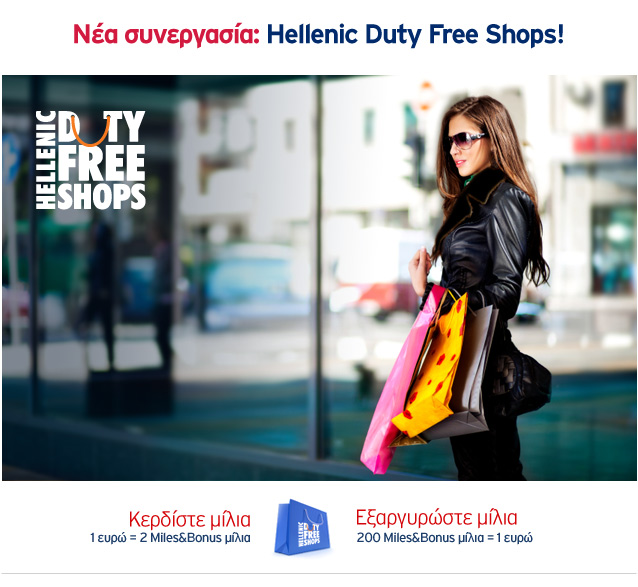 Τώρα το Miles&Bonus σε συνεργασία με τα Hellenic Duty Free Shops σας δίνουν την ευκαιρία να απολαμβάνετε περισσότερο τις αγορές πριν από κάθε σας ταξίδι. Επιλέγοντας από τη μεγάλη ποικιλία επώνυμων προϊόντων που σας προσφέρουν τα HELLENIC DUTY FREE SHOPS κερδίζετε μίλια από τις αγορές σας. Επιπλέον έχετε τη δυνατότητα να αξιοποιείτε τα Μίλια Εξαργύρωσής σας σε δωρεάν αγορές προϊόντων.