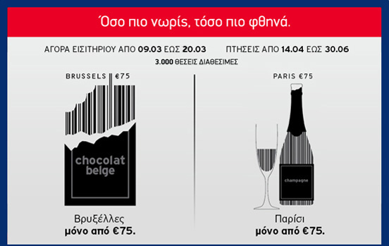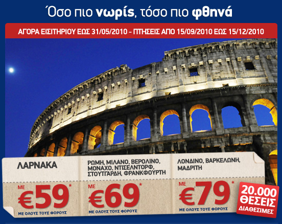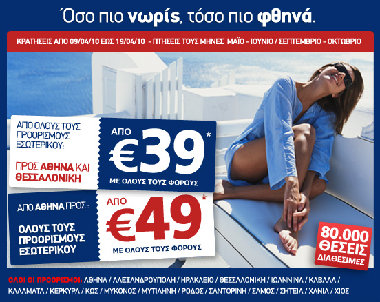 Η προσφορά αφορά σε απευθείας πτήσεις από/προς Αθήνα και Θεσσαλονίκη για Βαρκελώνη, Βενετία, Βελιγράδι, Βερολίνο, Βιέννη, Βρυξέλλες, Κάιρο, Κωνσταντινούπολη, Λάρνακα, Λονδίνο, Μαδρίτη, Μιλάνο, Μόναχο, Ντίσελντορφ, Παρίσι, Ρώμη, Στουτγάρδη,Τελ Αβίβ, Τίρανα, Φρανκφούρτη. Ισχύει για κρατήσεις έως 31/03/2010 και για πτήσεις από 01/05/2010 έως 30/06/2010 *Οι ναύλοι ισχύουν για απλή μετάβαση, περιλαμβάνουν όλους τους φόρους και τις αντίστοιχες χρεώσεις συναλλαγής ανά επιβάτη για αγορά εισιτηρίου από το site της Aegean. Δεν επιτρέπονται αλλαγές στο εισιτήριο, ενώ σε περίπτωση ακύρωσης δεν επιστρέφεται η αξία του ναύλου. Οι πτήσεις Αθήνα - Στουτγάρδη πραγματοποιούνται μέσω Θεσσαλονίκης. Ο ναύλος από Λονδίνο είναι £75. *Οι απευθείας πτήσεις από Θεσσαλονίκη είναι προς Λάρνακα, Φρανκφούρτη, Μόναχο, Στουτγάρδη και Ντίσελντορφ.